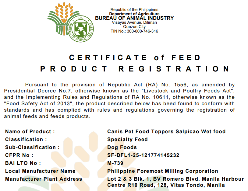 CERTIFICATE OF FEED PRODUCT REGISTRATION